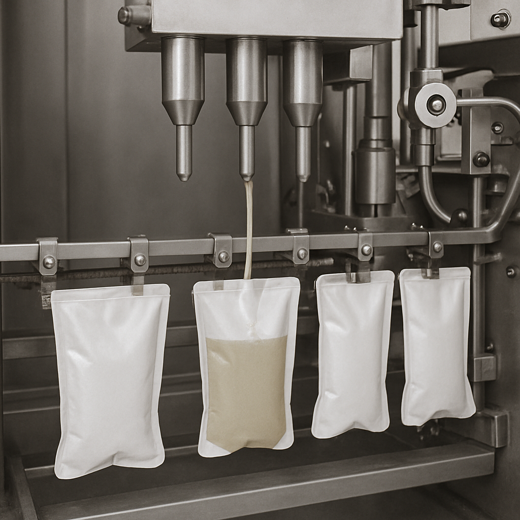 После стерилизации продукт передается в машину для асептического наполнения пакетов, где он расфасовывается в предварительно стерилизованные пакеты. Машина точно контролирует процесс наполнения, обеспечивая точный объем и консистенцию. После наполнения пакеты герметично запечатывают для предотвращения загрязнения.